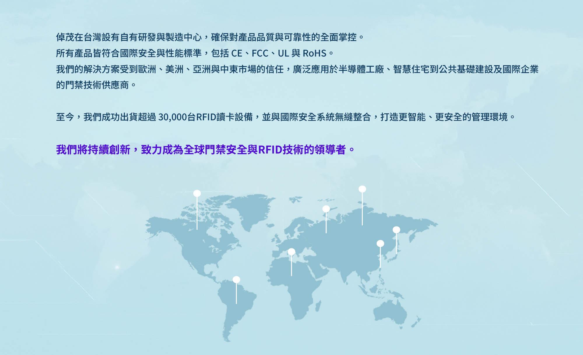 本公司以品質為核心,通過 ISO 9001 國際品質管理系統,並符合 CE、FCC、IP34 防水防塵 及 RoHS 等多項國內外規範,確保產品安全與可靠性。