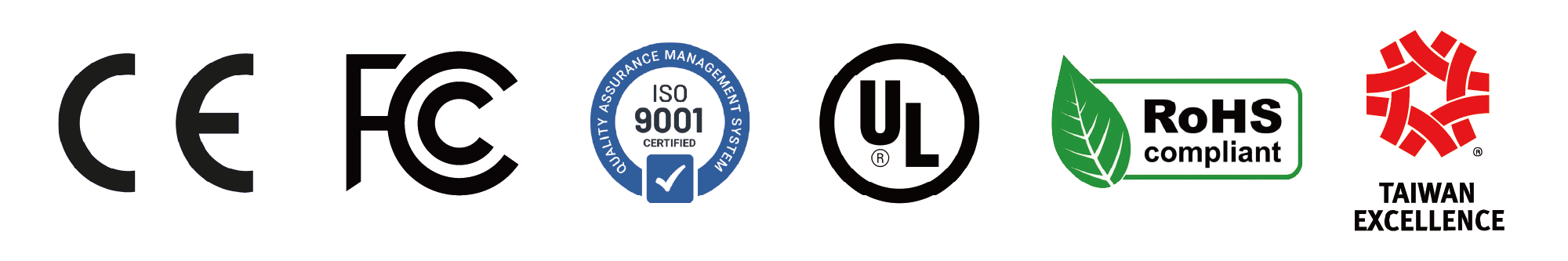 本公司以品質為核心,通過 ISO 9001 國際品質管理系統,並符合 CE、FCC、IP34 防水防塵 及 RoHS 等多項國內外規範,確保產品安全與可靠性。