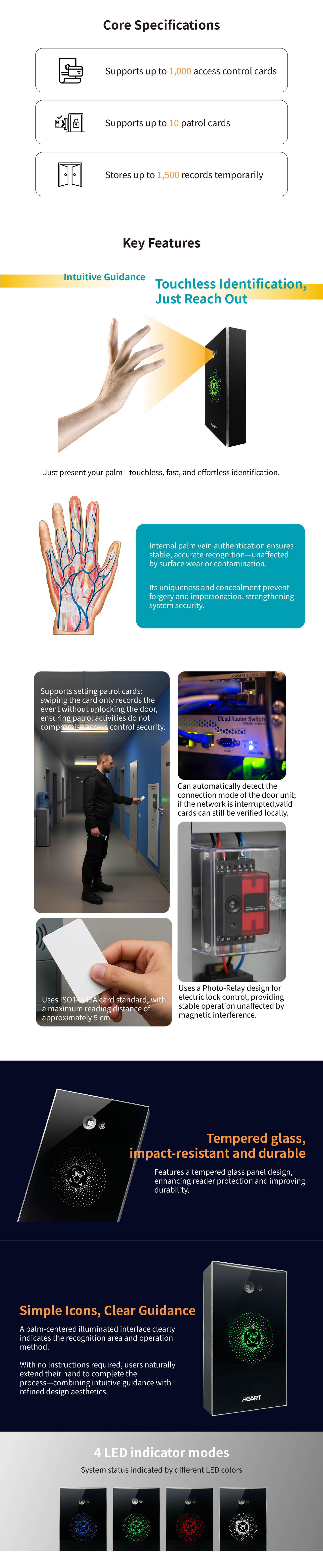 - Large-Capacity Data Storage: Stores up to 1,000 palm vein templates and access card records, with a buffer capacity of 1,500 access control event logs.