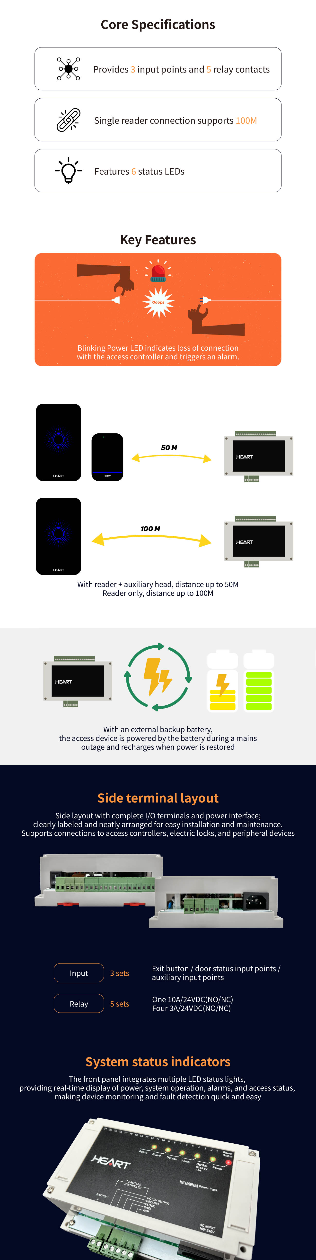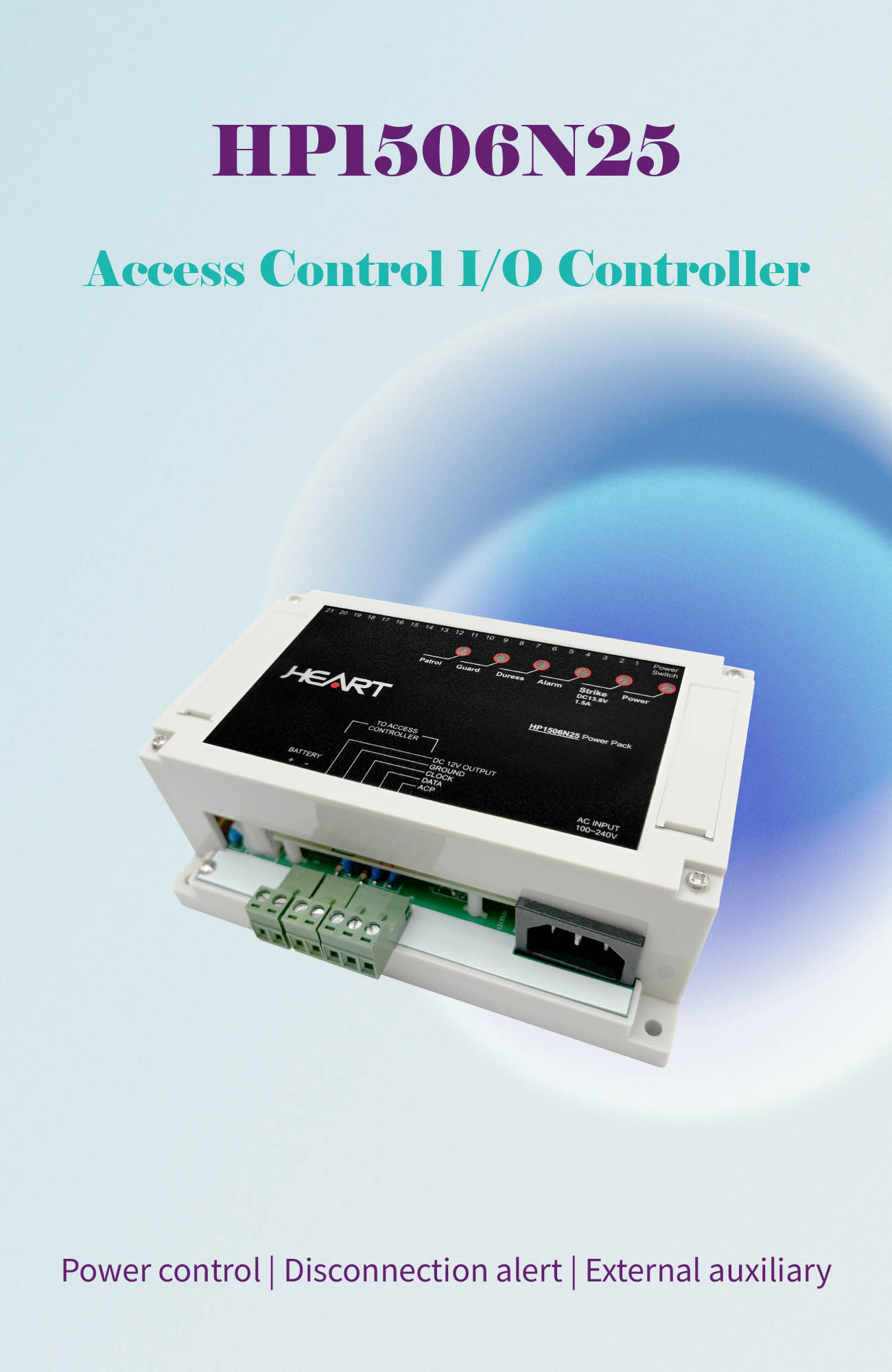 Product Number:HP1506N25This device integrates multiple input and relay contacts, providing power and signal connections for access control controllers, electric locks, and related equipment.