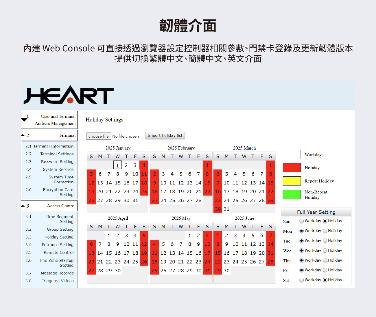- 彈性權限控管:支援每週 7 天獨立時區與每日 8 組通行時段設定,並可針對不同人員類型彈性設定假日表與通行規範。