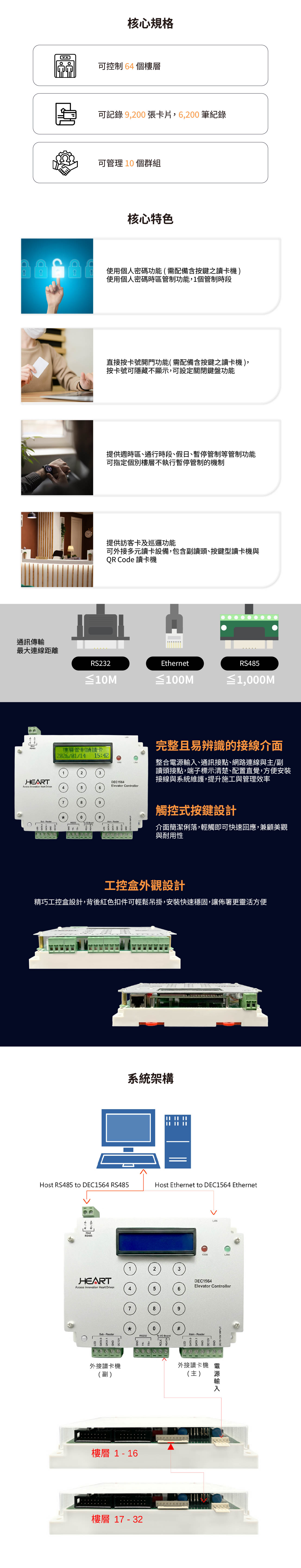 | 樓層管制數量 | 最多 64 個樓層 | 需搭配 DEB016 電梯控制 I/O Board |