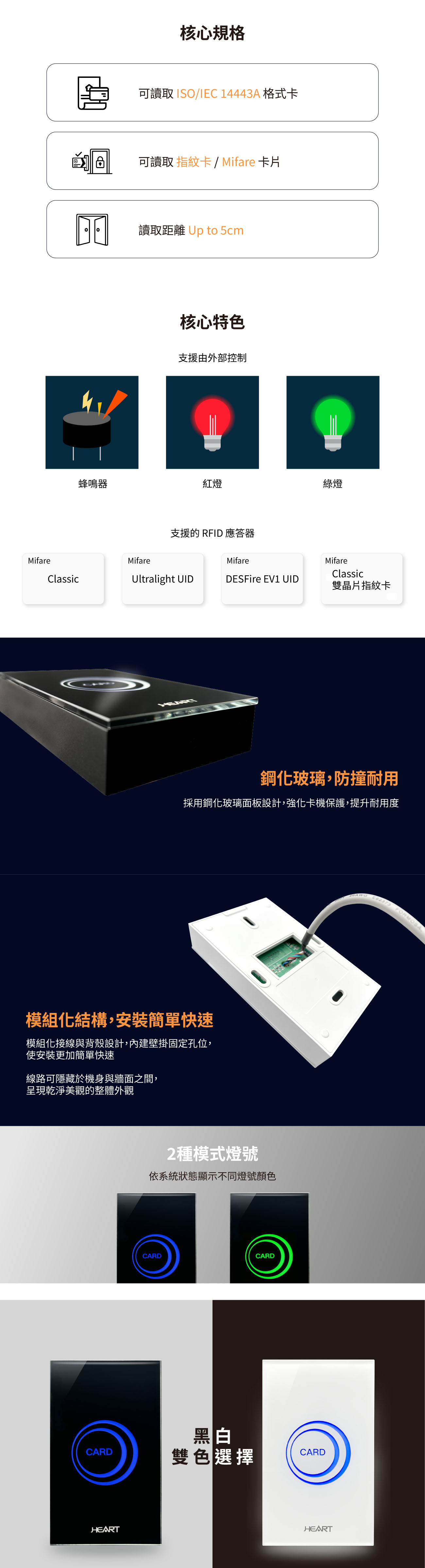 - 直觀的狀態提示:內建多色 LED 狀態指示燈與蜂鳴器,讓使用者能即時掌握感應狀態。